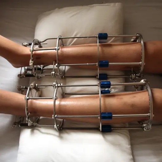 Ilizarov Method ili External Fixator Limb Lengthening. Starija metoda koja koristi metalne prstenove i šrafove spolja, postepeno razdvaja kost.